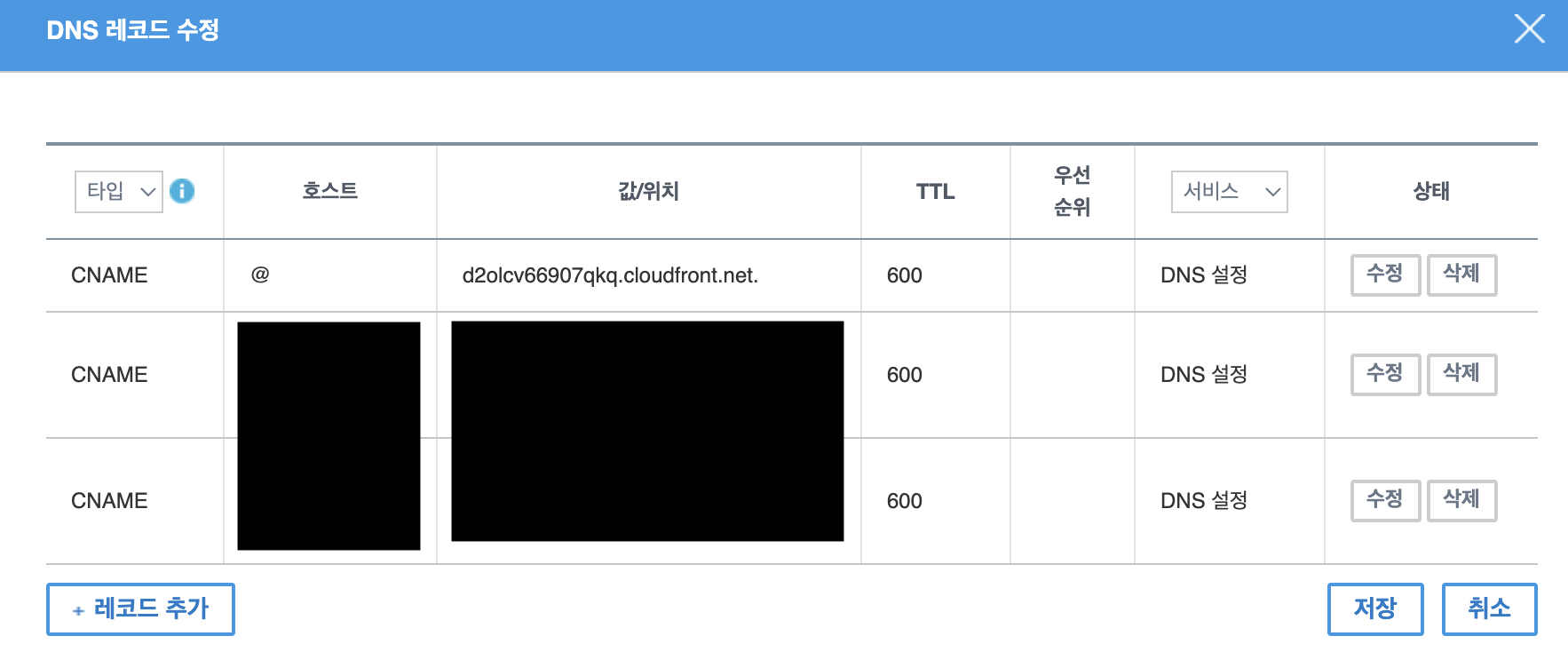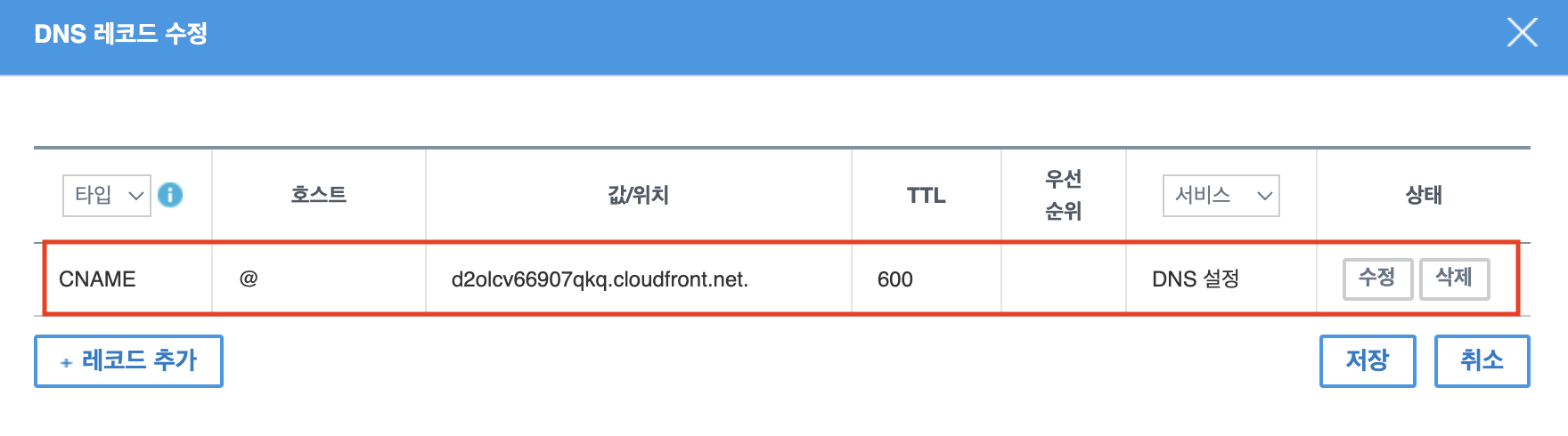 - 가비아에서는 호스트 이름이 없을 경우 @ 를 입력하는데 CloudFront 주소는 호스트 이름이 없기 때문