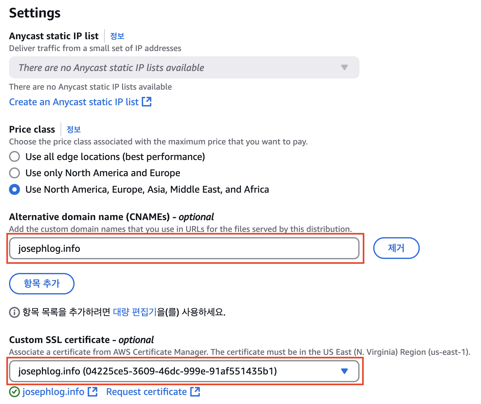 - 나머지 리전에서는 SSL 인증서가 발급이 불가, 만약 이를 원치않는다면 다른 SSL인증 발급을 알아봐야할 듯 싶다.