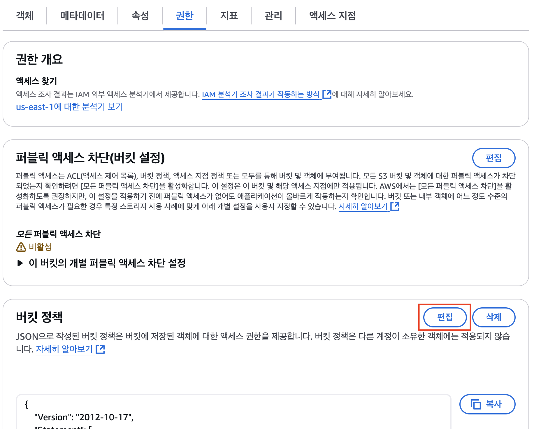 S3 버킷 권한으로 이동