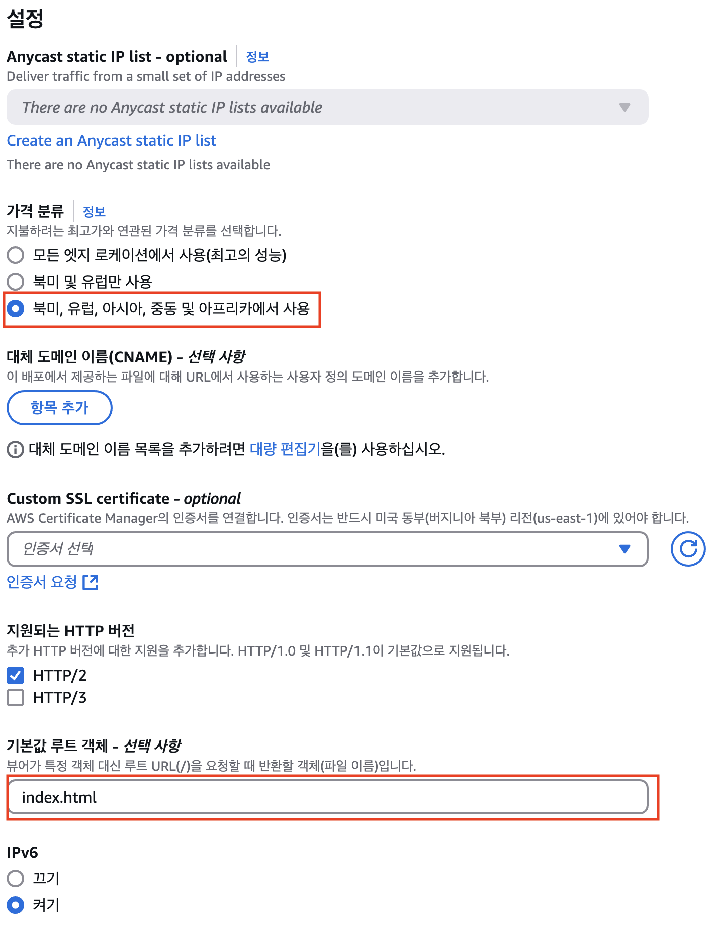 기본값 루트 객체 - 업로드한 정적 페이지의 홈 페이지 파일 이름을 입력한다.
