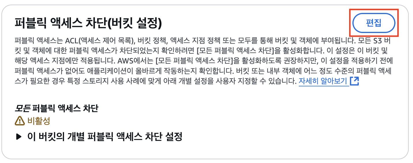 앞으로 CloudFront를 통해서만 버킷에 접근 할 수 있도록 퍼블릭 엑세스를 차단해야한다.