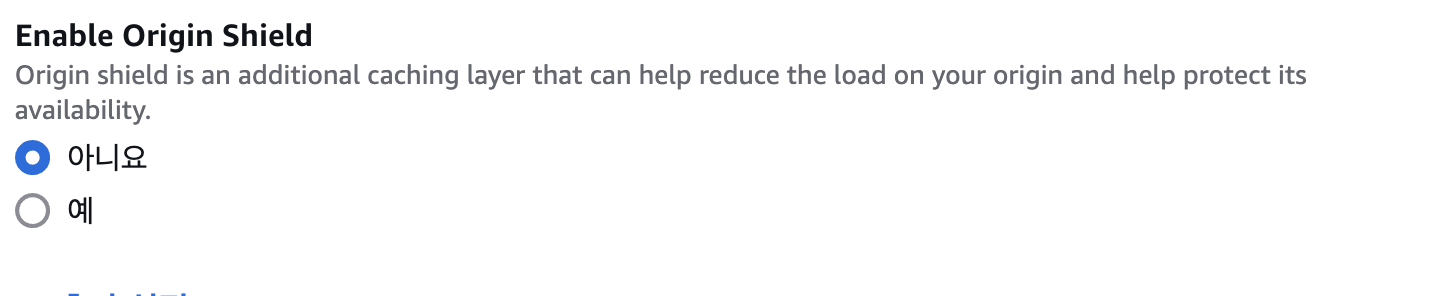 Origin Shield란 CloudFront 캐싱 인프라의 추가 계층으로 오리진의 부하를 최소화하고 가용성을 높이며 운영 비용을 절감하는데 도움이 된다. -> 향상된 캐시 적중률, 오리진 부하 감소, 향상된 네트워크 성능 (공식문서 참고)